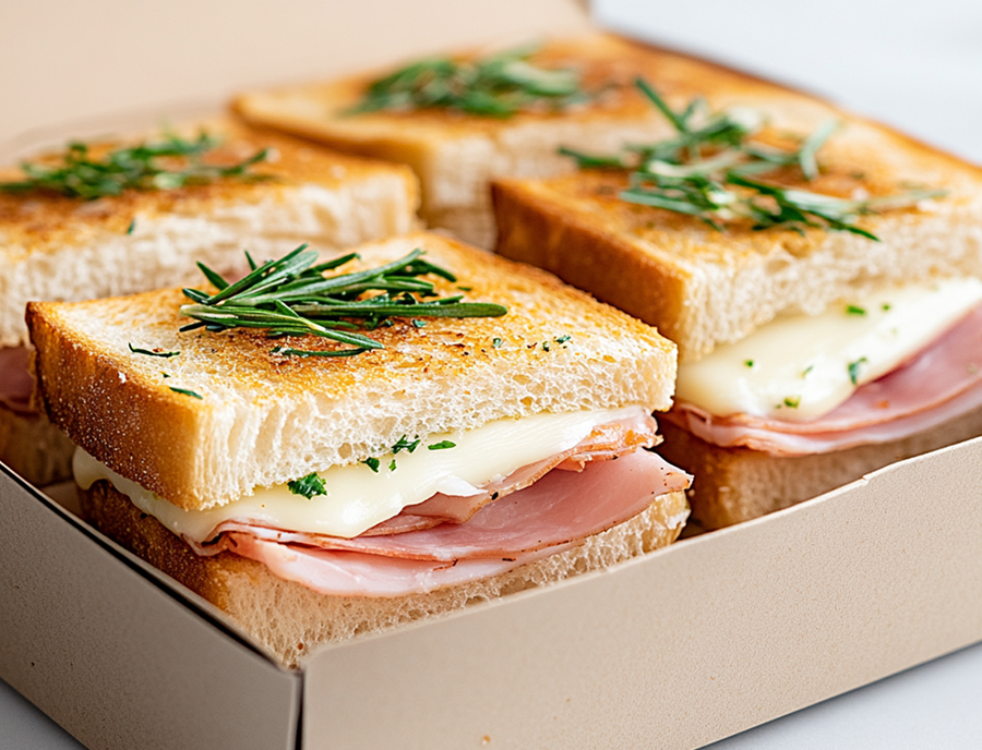 - Мини-сэндвичи 16 шт. Начинки: ветчина-сыр, буженина, куриная грудка, сёмга. Удобно как «база» под любой формат.